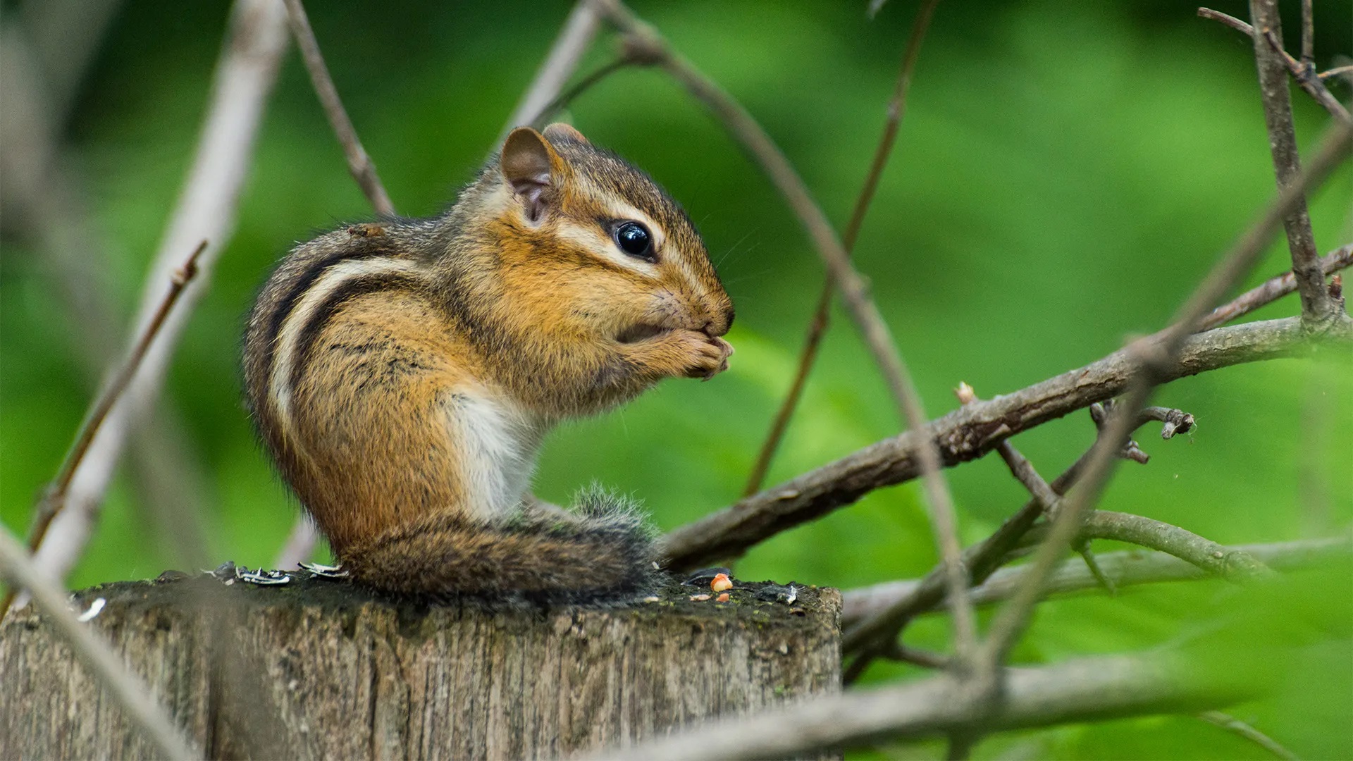 While more common in forests and woodlots, there’s a chance you might see one around your property foraging for food. Eastern chipmunks are mostly hoarders and will spend a significant portion of their day gathering and storing food in their burrows.