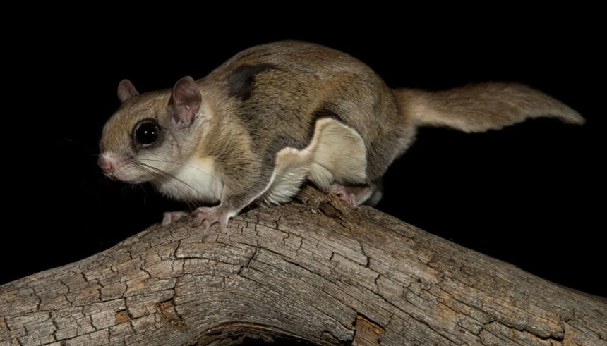 Other physical characteristics include dense fur and large eyes. Most species in the U.S. are between 8 and 12 inches long and can glide up to 160 feet in the air. That said, giant flying squirrels have been recorded gliding up to about 1500 feet in other parts of the world. This is made possible by loose skin and muscle that forms a fur-covered membrane between the front and hind limbs.