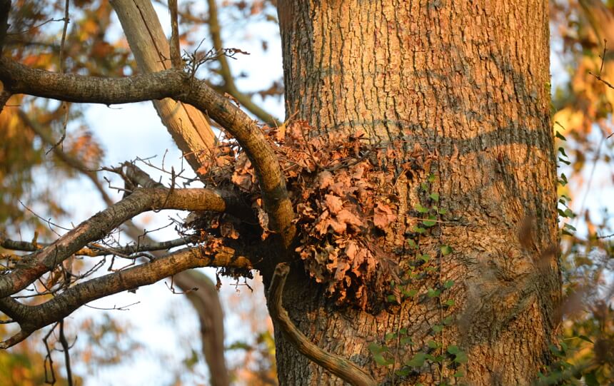 If there aren’t enough materials, the dreys can even consist of paper, wood, or garbage, depending on what’s available. Also worth noting is that squirrel nests incorporate the shape of the branches around them for better protection against the elements. As such, it’s more common to find them in branch forks.